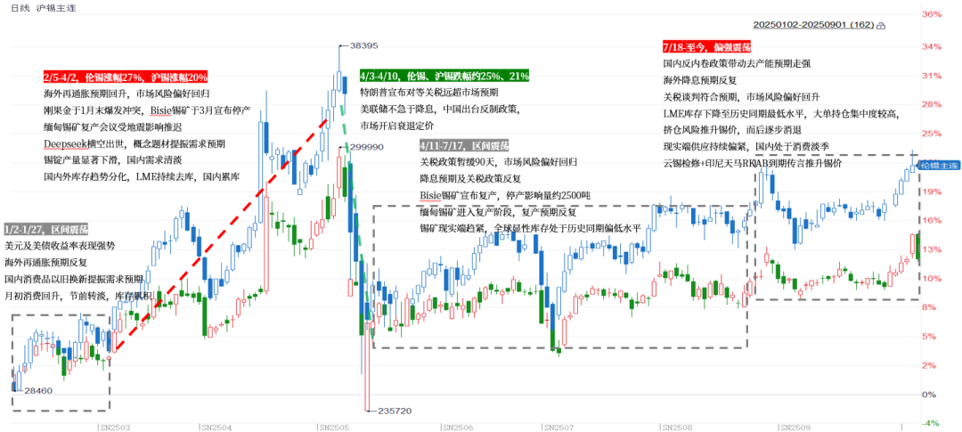 结论:宏观层面给予相对积极的信号,海外降息预期显著回升,国内宏观环境回暖,支撑金属价格偏强运行;基本面因矿端恢复不及预期,精炼锡的供需依然偏紧,锡价仍呈易涨难跌走势,重心持续上移,预计一个月期锡价波动区间为沪锡[260000,285000]元/吨,伦锡[32000,36000]美元/吨,关注供应端潜在的扰动风险。