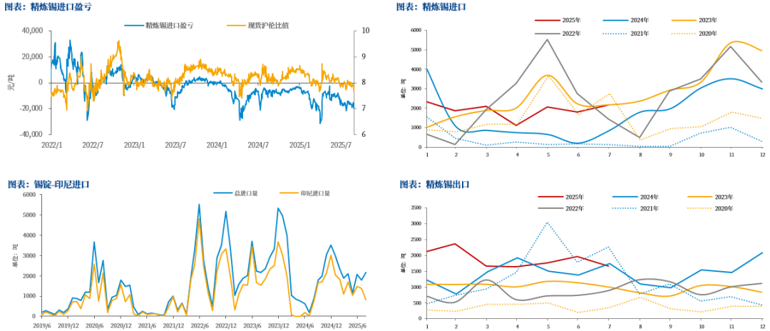 7月精炼锡进口量约为2167吨,出口量约为1673吨,环比分别增加381吨、减少300吨,8月沪伦比值窄幅震荡,精炼锡进口利润环比有所维持、出口利润小幅回升,预计进口量将小幅增加;