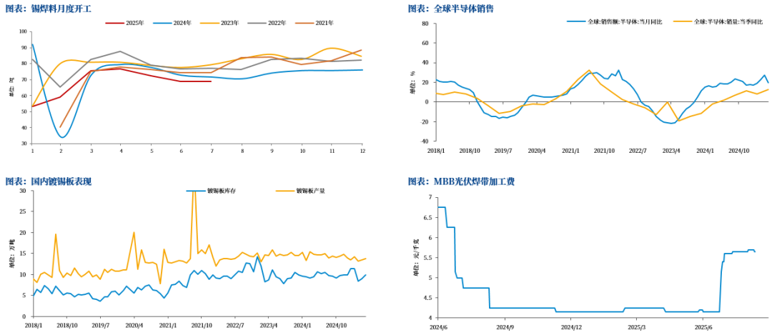 锡下游处于需求淡季,整体表现相对一般,光伏产业前期反内卷后劲不足,MBB光伏焊带加工费有所维持,抢装结束后,光伏对锡消费的贡献环比显著走弱;全球半导体仍处于上行周期,6月销售增速同比增加19.6%。