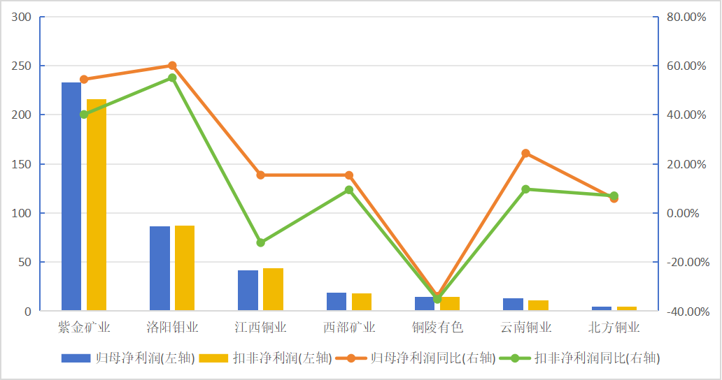 云南铜业通过对旗下冶炼企业的原料结构优化,矿山及冶炼单位完全成本均优于年度降本目标,其中冶炼加工成本创历史新低,叠加西南有色、滇中有色投产带来的产量提升和铜价上涨,企业上半年归母净利润和扣非净利润同比分别增长了24.32%和9.68%。
