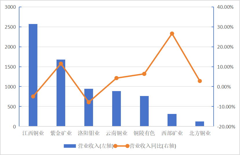 1. 营业收入与同比变化方面,七家铜企上半年合计营业收入超7200亿元,其中规模较大的江西铜业营收超过2500亿元,紫金矿业营收突破1600亿元;营收同比增幅最高的为西部矿业,营收同比增长26.59%;其次是紫金矿业,营收同比增长11.50%。