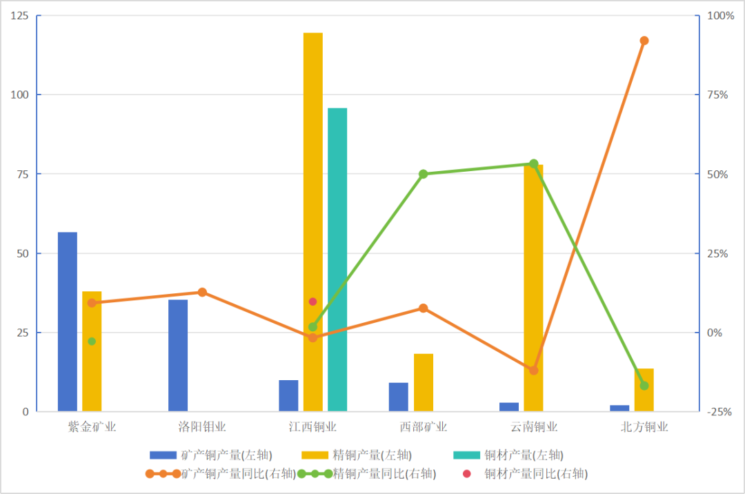 图3 2025年上半年国内主要上市铜企铜产品产量及其同比变化 (单位:万吨)