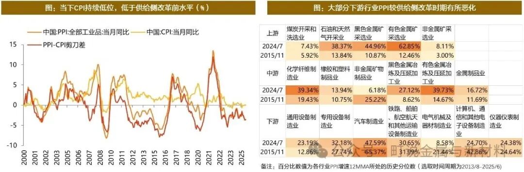 从CPI增速来看,对比2010-2015年和2021-2025年两个阶段,供给侧改革前CPI增速仍为正,而当下CPI同比围绕0值波动,显示上游原材料降价(两个阶段PPI均处于负值区间)未能有效刺激需求,下游企业盈利难以改善,传导至投资意愿萎缩、经济增长放缓。