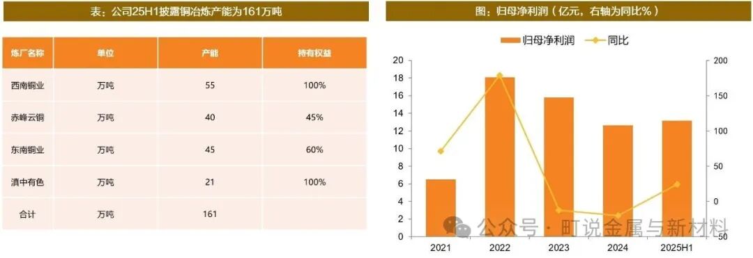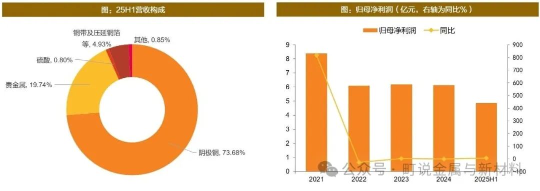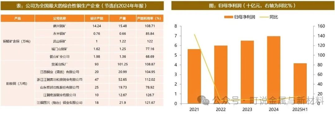 公司在铜以及相关有色金属领域建立了集勘探、采矿、选矿、冶炼、加工于一体的完整产业链,是中国重要的铜、金、银和硫化工生产基地。公司主要资产: 持有上市公司恒邦股份总股本的44.48%(截至25H1),5家在产冶炼厂,其中贵溪冶炼厂为国内最大单体铜冶炼厂,5座100%所有权的在产矿山等。至2024年,公司联合其他公司所控制的资源按本公司所占权益计算的金属资源量约为铜1,312万吨、黄金97.26吨,阴极铜冶炼产能213万吨,存在明显的规模、技术与产业链一体化优势。
