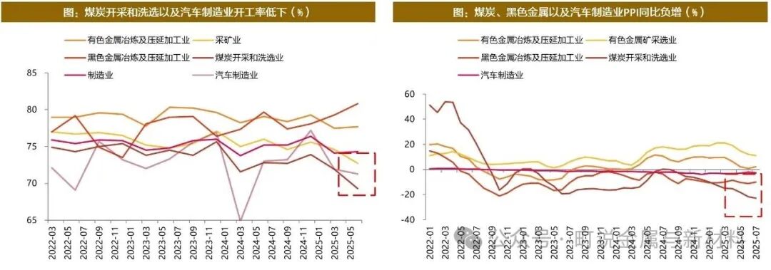 究其原因,类比供给侧改革的提出背景——即行业景气度低迷,遏制恶性竞争迫在眉睫。2023年以来,汽车制造业、煤炭开采和洗选业以及黑色金属冶炼及压延加工业PPI同比长期处于负值区间,2025年起煤炭、汽车制造行业开工率持续下行,黑色金属行业历经过2022-2023年地产板块承压时期的低位开工。因此,对于尚处相对萎靡阶段的该类行业,亟需避免无序竞争所带来的负反馈。