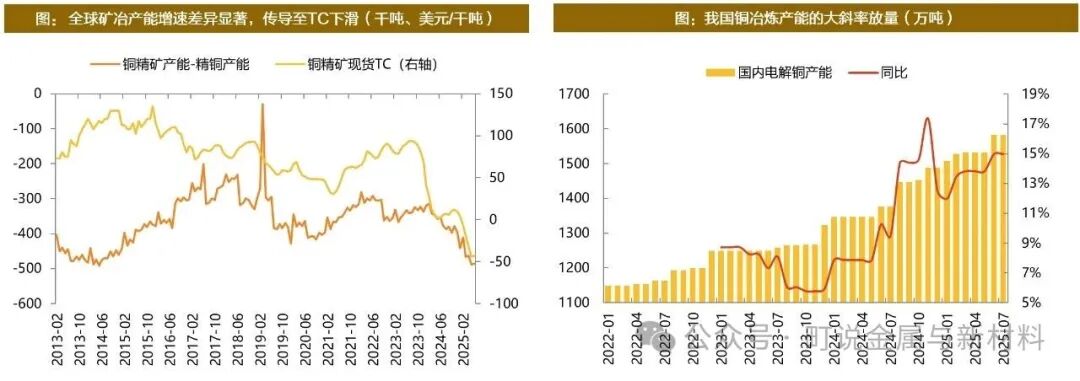矿冶产能之差直接映射至加工费TC/RC的趋势,影响炼厂利润。据国际铜业研究小组(ICSG)数据,2024年起,全球铜精矿产能和精铜产能差距持续扩大,截至2025年6月相差-48.6万吨,TC也随之逐阶下调。