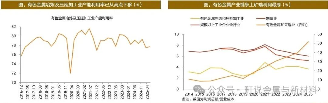 横向对比其他行业,目前有色采选及冶炼PPI位于正值区间,产能利用率高于汽车、煤炭等行业,因此改革的急迫性稍弱。然而若以时间轴纵向比对,无论是有色冶炼和压延加工还是采矿业,行业PPI和产能利用率均已过高点且处于缓慢下行通道,提前预防的重要性渐显。2025年7月18日,工信部在国新办发布会中提到实施新一轮钢铁、有色金属、石化、建材等十大重点行业稳增长工作方案,推动重点行业着力调结构、优供给、淘汰落后产能,具体工作方案将在近期陆续发布。
