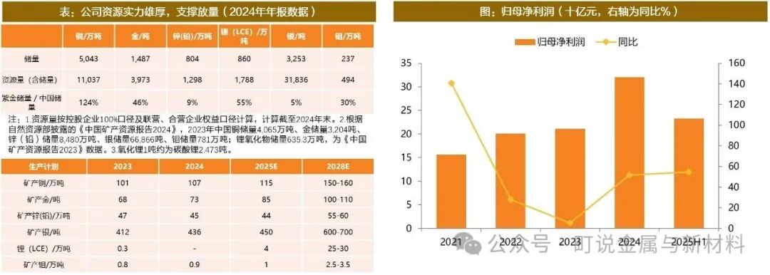 紫金矿业是一家在全球范围内从事铜、金、锌、锂等金属矿产资源勘查、开发及工程设计、技术应用研究的大型跨国集团,在香港H股和上海A股上市。截至2024年末,公司铜资源储量雄厚,为5,043万吨,冶炼铜产量近75万吨。