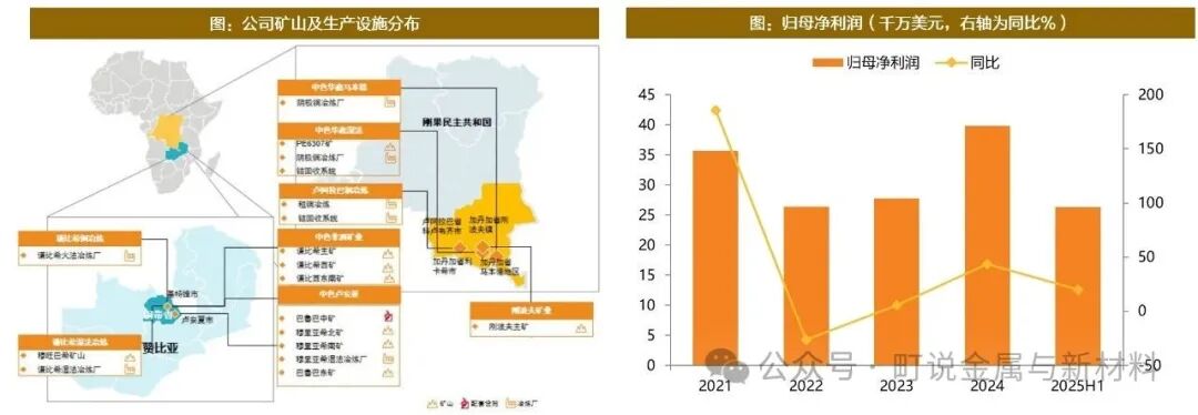 铜产品主导盈利,刚波夫矿冶产能有望齐增。25H1,公司自有矿山产阴极铜43,153吨,yoy-1%,公司阴极铜总产量为72,192吨,yoy+16%,自产粗铜及阳极铜42,053吨,yoy+17%,粗铜和阳极铜总产量为111,283吨,yoy-30%,粗铜及阳极铜、阴极铜收益占总收益的89.7%,主导公司盈利。刚波夫矿冶齐推进,西矿体项目预计于2028年投产,MSESA矿体于2024年完成资源量估算,正在进行可行性研究,湿法厂工艺系统整体优化项目于2024年8月获批,预计2025年建成投产。
