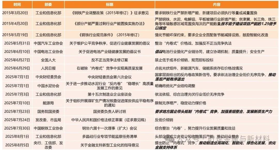 从“反内卷”相关发文来看需求终端光伏、新能源汽车等领域率先“受到点名”,旨在打破低价倾销、同质化竞争的现状。此外,上游端煤炭和钢铁等行业也再度迎来供给侧改革机遇。