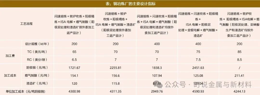 据《铜冶炼成本计算需关注的问题》(2013年),可得项目之间的单位加工成本存差异。另据中国有色金属报(2016年),对比三个相同规模、分别用双闪工艺、双底吹工艺、底吹熔炼-卧式顶吹吹炼工艺的铜冶炼项目的可研报告,底吹熔炼-卧式顶吹吹炼能耗、加工费最低,双闪最高,因双闪多了精矿干燥、铜锍粒化与干燥细磨、熔剂制备(石英、石灰石干燥磨矿)等工序。