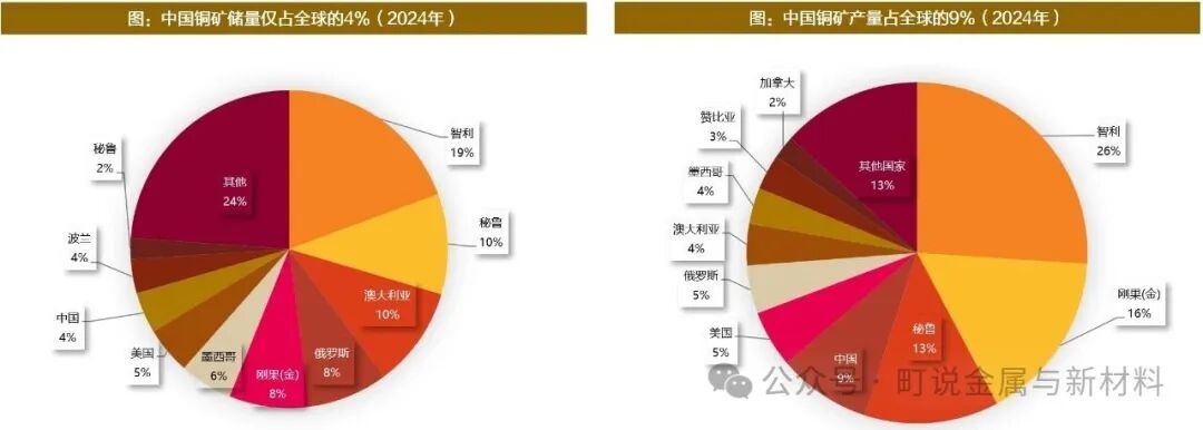 我国矿冶匹配明显不均。我国为全球第一大铜冶炼国,2024年贡献约45%的产量,然而前文提及我国铜矿储量和产量分别占全球4%和9%。