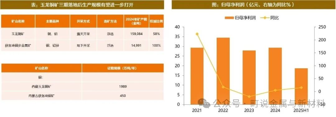 铜贡献主要毛利,玉龙铜矿潜力可期。25H1,公司矿产铜产量91,752吨,yoy+8%,冶炼铜产量182,249吨,yoy+50%。从毛利构成来看,2024年披露的铜类产品占比约为67%,为主要盈利支撑。未来铜版图有望进一步扩张,公司玉龙铜矿三期工程项目已于6月23日收到《西藏自治区发展和改革委员会关于西藏玉龙铜业股份有限公司玉龙铜矿三期工程项目核准的批复》,三期工程建成后玉龙生产规模将由1989万吨/年增加至3000万吨/年。