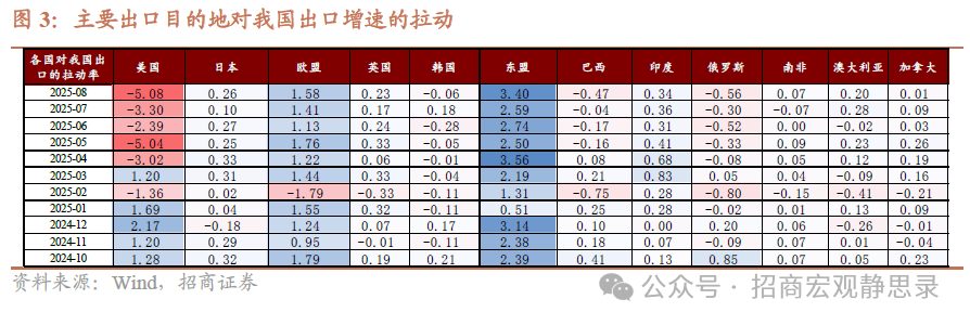 出口商品结构:1)机电和高技术产品继续主导增长。机电产品占中国出口比重稳定在六成以上,前8月累计出口同比增长9.2%,是拉动出口的主要动力。其中,新一代高附加值产品增长亮眼,集成电路8月出口同比激增32.8%,连续5个月保持在20%以上的高速增长,反映在全球AI算力需求旺盛和国产替代加速背景下,我国集成电路出口保持强劲势头。汽车及零部件出口势头不减,8月同比增长17.3%,在欧盟、东南亚等市场新能源汽车渗透率不断提高,带动汽车出口连续数月保持两位数增幅。此外,受海外造船需求回升影响,8月船舶出口同比大幅增长近35%。以电动载车、锂电池、光伏组件为代表的“新三样”产品前8月出口继续保持两位数的快速增长,成为推动出口结构升级的重要引擎。2)传统劳动密集型品类出口持续承压。受海外消费放缓影响,纺织服装等劳动力密集型产品占比进一步缩小,前8月占出口总值的比重降至15.6%。8月当月纺织品及制品出口同比仅增约1.4%,服装及衣着附件则大幅下降约10%,较7月的微幅下降明显放大。包括家具、箱包、鞋类等在内的传统品类订单依然不足,出口增速表现低迷。这表明外需疲软对我国传统制造业出口形成拖累,我国出口增量更多来自于高附加值的新兴产品而非传统品种。