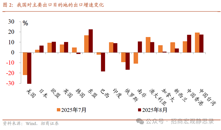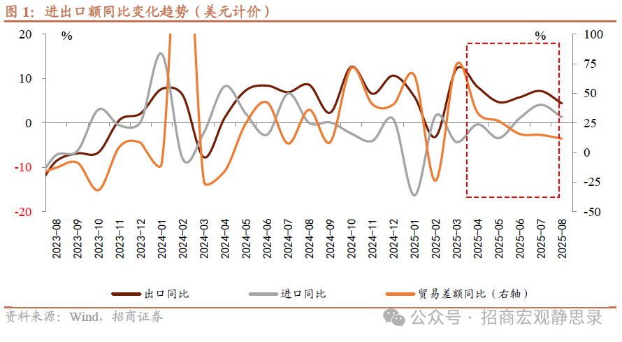 整体上看:8月出口同比增速回落但仍保持正增长,进口增速小幅放缓,贸易顺差依然处于高位且较上月有所扩大,呈现出“抢出口动能减弱、内需仍需进一步释放”的特征。8月出口同比增长4.4%(前值7.2%),增速为近6个月新低,低于我们和市场的预期。出口增速放缓一方面受到去年同期基数走高的影响,更主要的是对美直接出口大幅走弱。随着中美关税暂缓期再次延长,“抢出口”效应明显减退,企业在8月已缺乏前期那种赶在关税上调前出货的动力,对美出口大幅下滑成为拖累出口的主要因素。我国8月制造业PMI中新出口订单指数仍处于荣枯线下方,但较上月小幅回升,表明外需收缩的态势有所缓和,但总体来看外需压力仍然存在。值得注意的是,在对美出口走弱的同时,中国外贸的多元化布局和新动能发挥了重要作用,对东盟、拉美、非洲等市场的出口加速增长,新兴市场需求的提升以及出口产品竞争力较强,使得出口增速尽管放缓但仍能保持正增长。