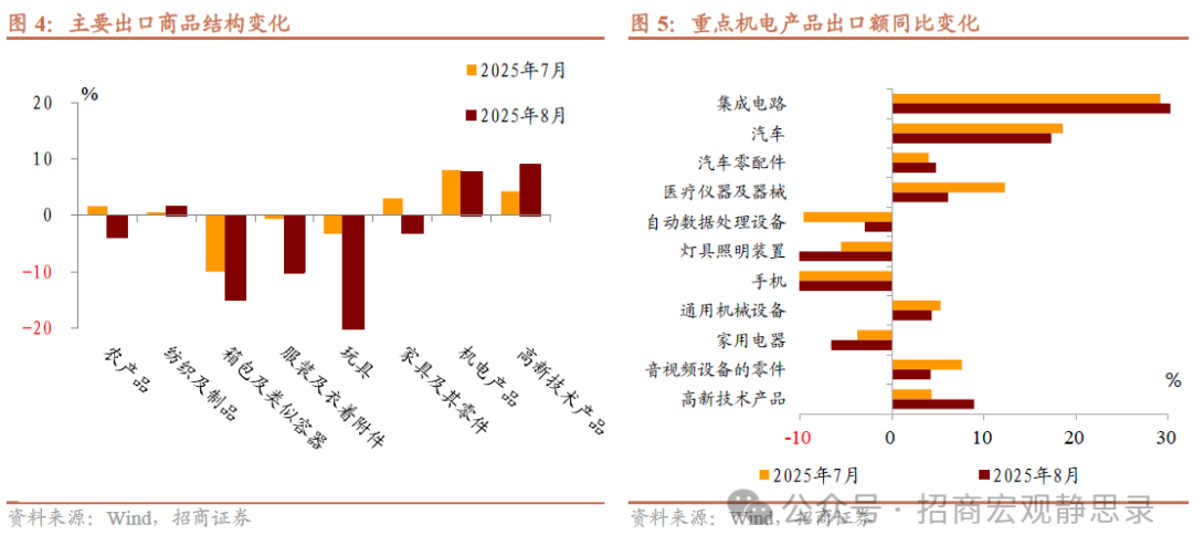 出口目的地:从出口市场来看,东盟、欧盟等非美市场是支撑8月出口正增长的主要力量,而美国市场对我国出口的拖累愈发凸显。8月我国对东盟出口同比增长22.5%,较上月加快了近6个百分点;对欧盟出口同比增长10.4%,比上月加快约1个百分点。两者合计拉动当月出口增速约5-6个百分点,其中对东盟单月出口额达571亿美元,继续保持我国第一大出口市场地位。此外,对日本出口同比增长6.7%,较上月明显加快;对拉美、非洲等新兴经济体的出口亦延续较快增长势头。前8个月,我国对共建“一带一路”国家的出口占比已经接近出口总额的一半,对“一带一路”沿线国家进出口总值同比增长5.4%,显示贸易多元化在外部需求波动下起到了重要缓冲作用。相比之下,美国市场继续拖累我国出口,8月对美出口同比大幅下降33.1%,降幅比7月进一步扩大了11个百分点,美国单月需求下滑对整体出口增速的负向拉动约在5个百分点左右。可以看到,在美国新一轮关税政策生效前,前期进口商集中囤货的现象已基本结束,“抢出口”效应退潮后对美出口迅速回落。需要关注的是,美国8月起对未达成贸易协议国家提高关税税率,并额外设置了高达40%的“转运税”条款,这可能对东南亚国家帮助中资产品转口美国的模式形成打击。虽然8月我国对东盟的出口依然保持高速增长,但未来几个月这一增速可能会因为转口贸易受限而有所放缓。