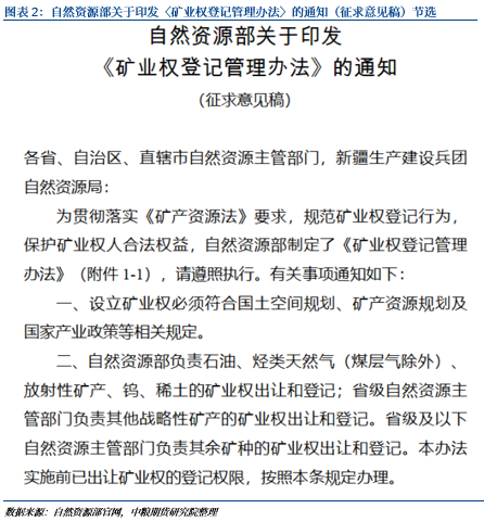 2025年5月16日,为贯彻落实新修订的《矿产资源法》,规范矿业权登记行为,优化完善矿产资源勘查开采许可管理制度,促进矿产资源合理开发利用,自然资源部网站发布,起草了《自然资源部关于印发〈矿业权登记管理办法〉的通知(征求意见稿)》《自然资源部关于矿产资源勘查开采许可管理有关事项的通知(征求意见稿)》,现向社会公开征求意见。征求意见稿中,将战略矿种锂矿的审批权下放到了省级(详见下图),市场认为这会加快锂矿的审批进度。