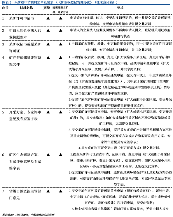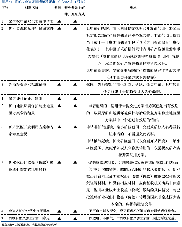 根据目前在实行的自然资规〔2023〕4号文《自然资源部关于进一步完善矿产资源勘查开采登记管理的通知》完善矿产资源勘查登记管理,其中附件4明确了采矿权申请资料清单及要求,涉及采矿证延续和采矿证变更开采主矿种、开采方式的审批所需资料基本一致。具体如下