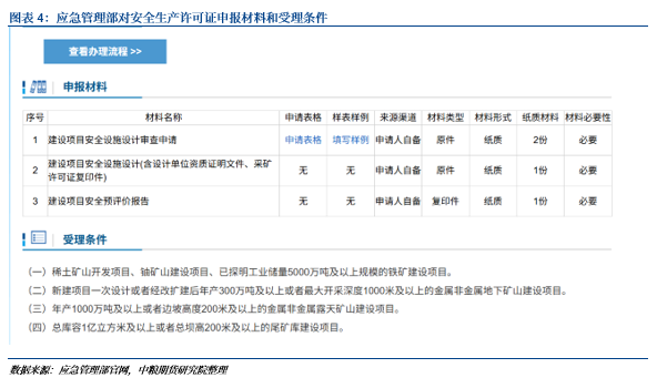 金属非金属矿山建设项目安全设施设计的行政许可,实施主体为国家矿山安全监察局,法定办结时限20个工作日,承诺办结时限20个工作日。法定办结时限说明,办理过程中所需的材料补正、检测、鉴定、现场核查、专家评审、整改等不计入时限。安全生产许可证的审查依然有国家级、省级和市县级,下图为国家级的申报材料和受理条件。