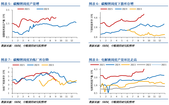 7月锂矿大量到港,为国内碳酸锂产量创新高提供了原料基础。下半年,随着非洲马里锂矿稳定到港及新疆大红柳滩矿区放量,国内锂辉石加工产能因氢氧化锂产线转换而充裕,8月国内碳酸锂产量在云母矿停产后反而上升。预计第四季度碳酸锂进口量将进一步增长,因此在现有旺季预期下,实际去库幅度可能不及去年同期,需要电池端产能进一步释放才能刺激更多需求。