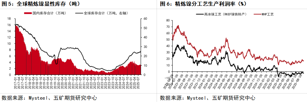 近期镍铁价格表现强势,但精炼镍库存压力显著,对镍价形成拖累,镍价与镍铁价格走势出现背离,若后市精炼镍库存延续近期增长态势,镍价或存在进一步下探寻找估值底的动能。但从长周期角度来看,镍价不具备深跌基础。一方面,全球红土镍矿供应集中在印尼,印尼政府通过RKAB审批制度间接对镍价进行调控,近期印尼政府敦促企业于2025年10月开始重新提交2026年RKAB预算,若审批情况不及预期,或加强矿端价格支撑的逻辑。另一方面,就估值而言,无论是火法一体化工艺还是成本更低的湿法一体化工艺,近两年成本均出现了明显抬升,导致冶炼利润率目前已经处于较低水平,进一步限制了镍价的下跌空间。