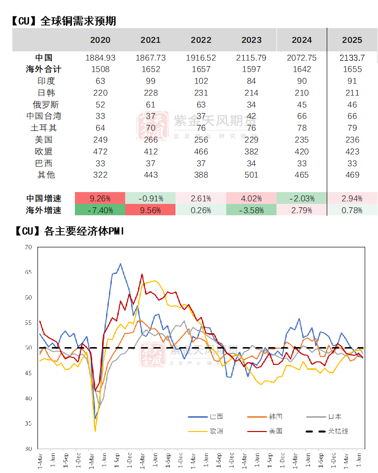 我们下调2025年海外市场主要地区铜元素需求量预期,约1654.8万吨,增速0.78%。