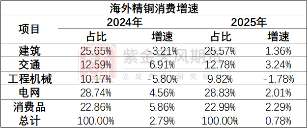 在构建的消费预期上,考虑到2024年的低基数表现,2025年同比出现微增,但弱于中国及美国增速。从精炼耗铜量来看,预计2025年耗铜量1170.2万吨,增速0.72%;从铜元素来看,2025年海外铜终端需求量1654.8万吨,同比增速0.78%,较24年增加12.9万吨。其中,精炼耗铜量考虑其他非主流铜材精炼铜使用量(如雕塑、合金、不锈钢等)并剔除其他型材原料消耗铜杆量。