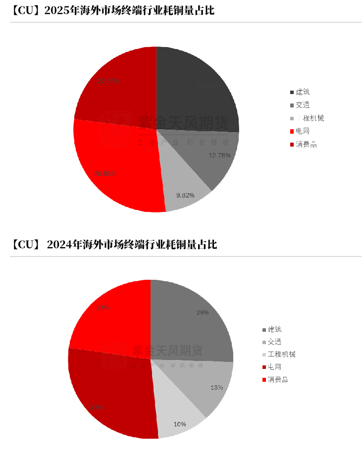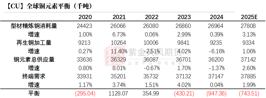 在构建的消费预期上,2025年同比存在一定增量。从精炼耗铜量来看,预计2025年耗铜量2780.8万吨,增速3.13%;从铜元素来看,2025年全球铜终端需求量3788.5万吨,同比增速1.99%,较24年增加73.8万吨。其中,精炼耗铜量考虑其他非主流铜材精炼铜使用量(如雕塑、合金、不锈钢等)并剔除其他型材原料消耗铜杆量。