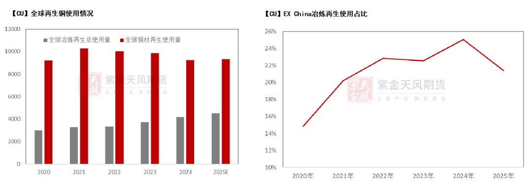 从左图中我们可以发现,无论是全球还是海外市场,铜元素供应将更多依附再生铜供应量级,以满足终端消费市场增速。但需要注意的是,其中50%以上再生挖掘潜力来自中国。与全球平衡不同,海外市场在26年后,按照再生与矿产元素供应占比计算,铜元素供应增速与消费增速差额将高达2%以上。
