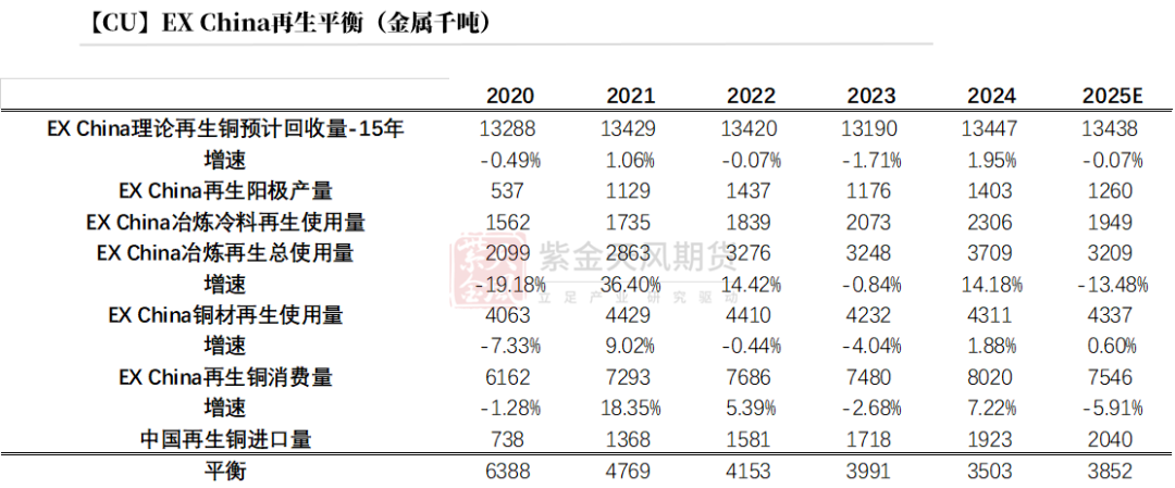 经数据调整,从供应角度顺推来看,预计国内理论再生供应量在740.56万吨左右。预计2025年进口废铜金属量204万吨。即2025年全年再生供应量在944.56万吨。