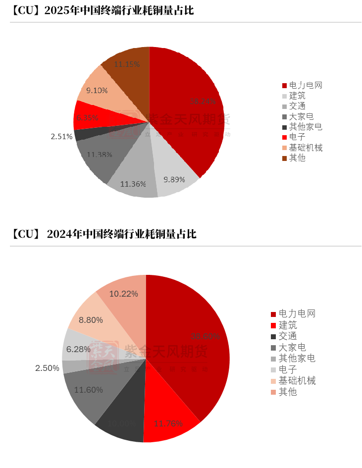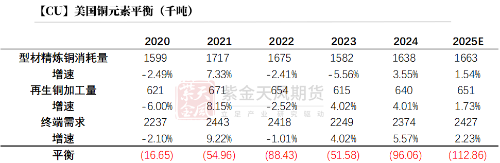 在构建的消费预期上,考虑到2024年的低基数表现,2025年同比存在明显的增长趋势。从精炼耗铜量来看,预计2025年耗铜量1607.5万吨,增速4.74%;从铜元素来看,2025年中国铜终端需求量2133.77万吨,同比增速2.94%,较24年增加60.95万吨。其中,精炼耗铜量考虑其他非主流铜材精炼铜使用量(如雕塑、合金、不锈钢等)并剔除其他型材原料消耗铜杆量。