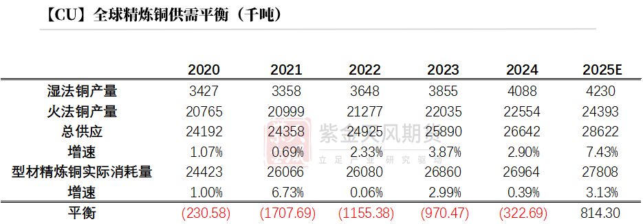 基于平衡表而言,2025年全球精炼铜过剩81.43万吨,铜元素供应短缺74.35万吨。
