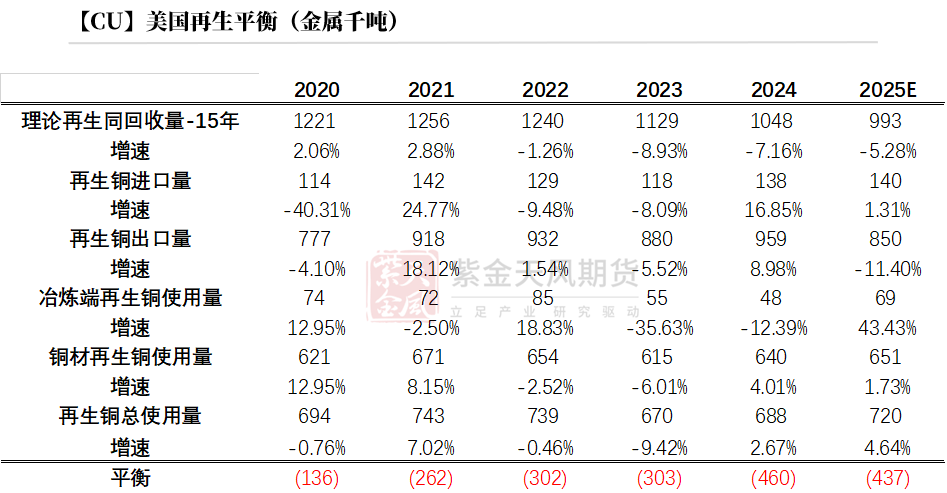 2025年,从最新数据推算,美国再生市场2025年短缺43.7万吨。值得注意的是,从2016年开始,美国再生铜始终处于年度短缺的状态。