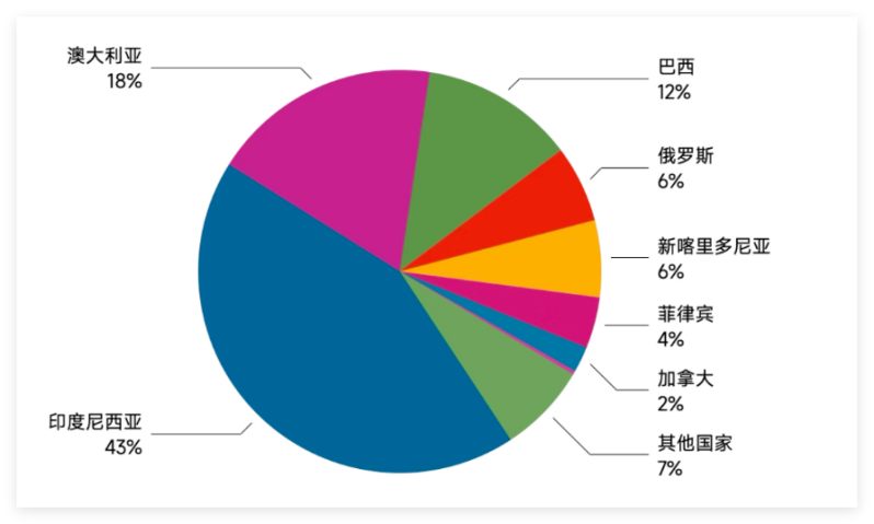 根据USGS的数据,2024年全球镍储量约为1.3亿吨,其中印尼是全球镍储量最为丰富的国家,占全球镍总储量的43%左右。此外,澳大利亚和巴西分别占全球镍储量的18%和12%;而2024年全球镍金属产量约为352万吨,其中产量最高的国家也是印尼,占比30%,菲律宾、巴西以及俄罗斯占比20%、15%、10%。
