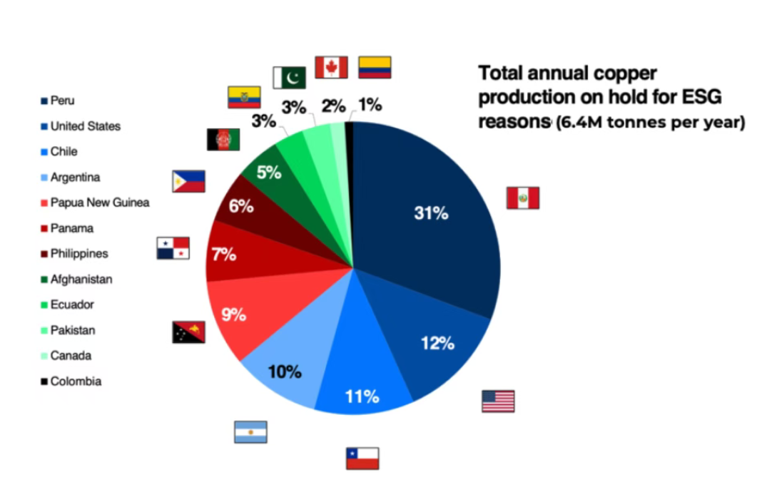 GEM Mining Consulting 发布的一份研究显示:全球超过 25% 的铜供应、约 640 万吨产能,被 ESG(环境、社会与治理)问题所阻碍。这些项目并非因为地质条件或技术难题停摆,而是受困于环保审批、社区冲突、治理不稳定等“软性障碍”中。
