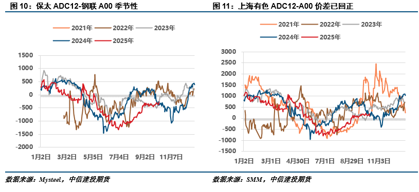 除开涨跌幅以及振幅有悖历史经验外,近期ADC12与A00的价差走势也呈现出期现不一致的异样。现货价差我们以上海有色ADC12-A00以及保太ADC12-钢联A00作为参考,其中有色及保太的ADC12报价差异相对较大,而有色及钢联的A00报价差异则可基本忽略不计。