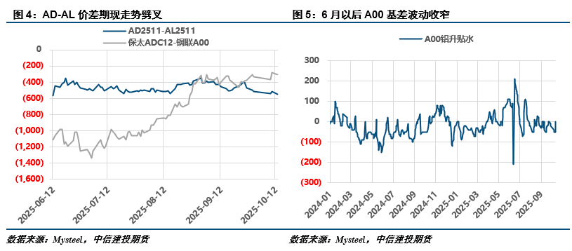 期货AD2511-AL2511自开市以来一直低位震荡于-570—-350左右,不过无论是上海有色口径下的ADC12-A00现货价差,还是我们一直作为参考标准的保太ADC12-钢联A00现货价差,8月以来均呈现明显修复的走势,也正是8月起期现价差出现明显劈叉走势。期货上市初期,由于距离交割月尚有时日,期现出现明显偏移走势可以看作是对未来的预期计价,但一旦临近交割这一期现重叠时间点,大幅的偏移或蕴含着回归中枢的套利机会。