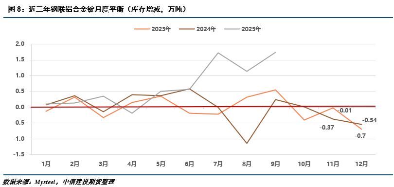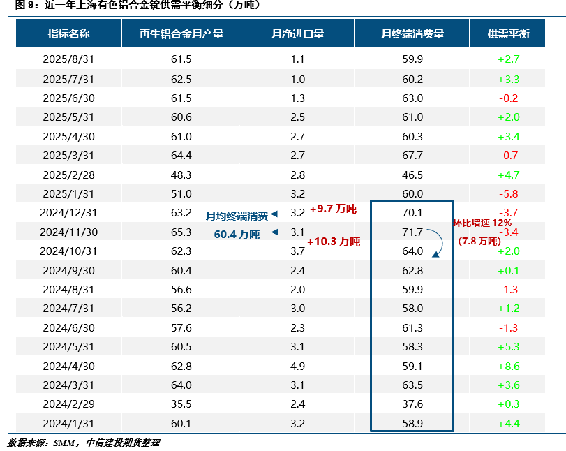 从现货层面看,季节性因素是11-12月AD-AL价差修复的基础保障。以供需平衡的月度表征库存变化量来看,近三年11、12及1月份去库相对确定,而上海有色给出的供需平衡细分数据,更是给到2024年11、12月需求量超过年度均值10万吨左右的水平,11月需求量的环比增速也达到12%。目前终端消费量走势与去年大致匹配,11-12月消费仍然值得期待。
