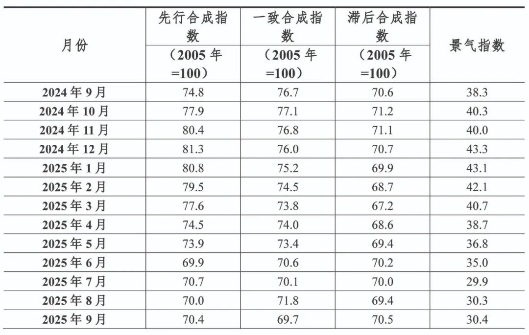 9月份,先行合成指数为70.4,较上月上升0.4个百分点。经季节调整后,同比出现上升的指标有5项,分别是LMEX指数、M2指数、汽车产量指数、有色金属固定资产投资额指数及有色金属进口额指数,升幅分别是4.1%、8.6%、1.9%、6.6%和1.0%;环比出现上升的指标也有4项,分别是LMEX指数、M2指数、商品房销售面积指数及有色金属固定资产投资额指数,升幅分别是5.0%、1.2%、1.3%和2.3%。