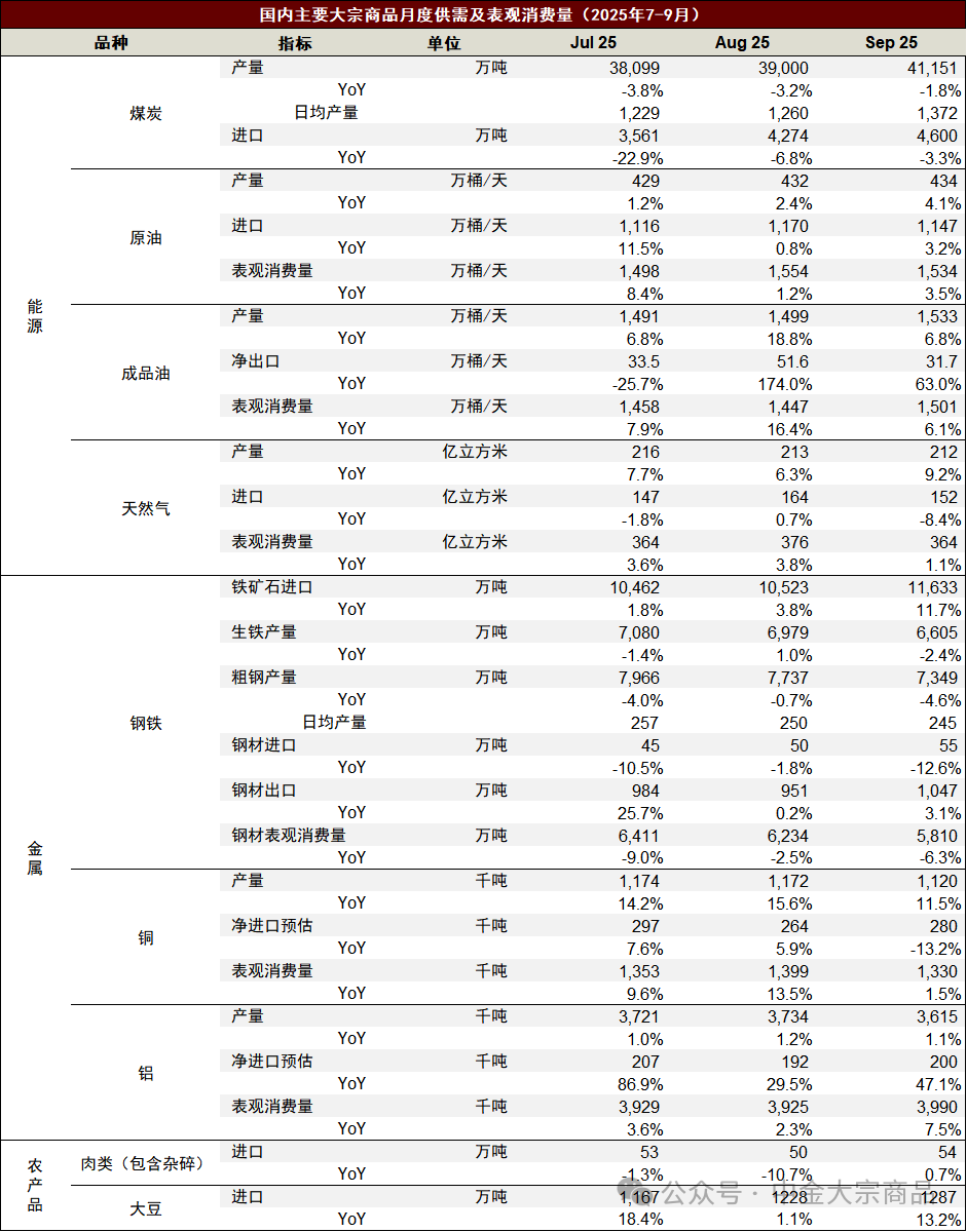 国内主要大宗商品月度供需及表观消费量