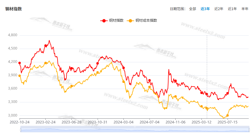 本期,全国各地市场建筑钢材价格波动较小:其中,北方市场徘徊,小幅起落;南方期螺引领,频繁上下。本周西本钢材指数小涨,成本指数回升,显示长流程钢厂利润空间未能拓展;本周螺纹钢期货主力合约低位起伏,对现货有示范作用。(下图为红色线条为钢材指数,黄色线条为成本指数)