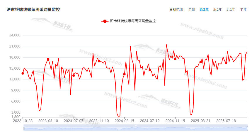 本期,西本资讯监测的沪市线螺周终端采购量为1.95万吨,周环比增加3.72%(见下图)。本周终端需求环比略有增加,显示刚性需求回归正轨。