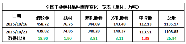 据西本资讯历史数据,当前库存总量较上年同期(2024年10月24的857.30万吨)增加251.53万吨,增幅为29.34%。分品种看,本期五大钢材品种库存中,中厚板库存回升,其它品种降库。(见下图)