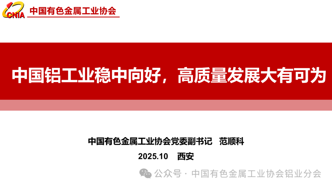 10月29日上午,2025年中国国际铝业周在陕西西安开幕,中国有色金属工业协会党委副书记范顺科出席开幕式并作题为《中国铝工业稳中向好,高质量发展大有可为》的主旨报告。全文如下。