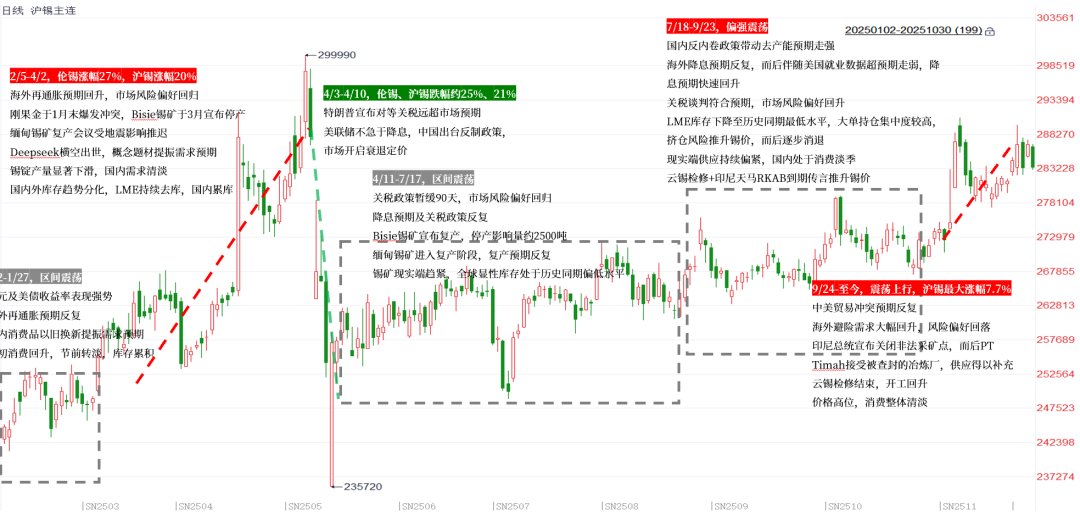 近期锡价基本面表现相对平稳,更多受国内外宏观预期主导,而在宏观面利好因素相对集中的时点,锡价表现相对强势,关注后续宏观预期的反复对锡价的影响;基本面在供应端持续受限使得供需缺口不断放大的背景下,预计锡价将维持震荡偏强走势,但因当前锡价整体处于相对高位,消费端或抑制其上方空间,预计一个月期锡价波动区间为沪锡[275000,300000]元/吨,伦锡[34500,38500]美元/吨,关注供应端恢复及国内需求大幅走弱的风险。