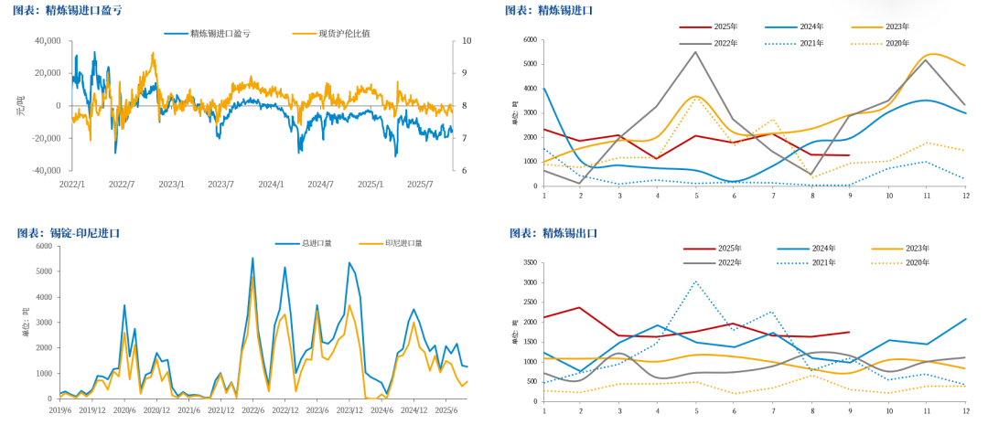 9月精炼锡进口量约为1269吨,环比减少27吨,出口量约为1748吨,环比增加108吨,10月沪伦比值先扬后抑,环比9月基本持平,预计后续进口量将保持当前水平;