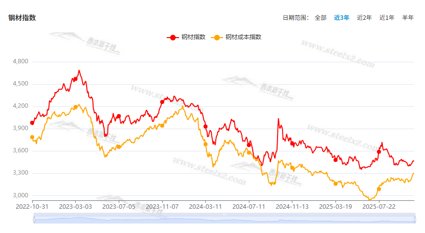 行业面上,据国家统计局数据,前三季度钢铁行业盈利973.4亿元,较去年同期大幅增长;而中钢协数据显示,同期重点钢企利润总额960亿元,同比增长1.9倍。数据表明,在粗钢产量同比减少、表观消费量持续下降的前提下,国内钢铁企业有望实现2022年以来最好的经济效益水平。另据中物联钢铁专委会发布的钢铁PMI数据,2025年10月份环比上升1.5个百分点,结束连续2个月环比下降态势;分项指标中,生产、新订单、新出口订单指数环比回升,产成品和原材料库存指数环比下降,数据表明行业运行有所恢复。展望后期,预计供需弱平衡的格局还将延续,如果没有大范围的减产出现,建筑钢价很难走出单边拉涨行情。