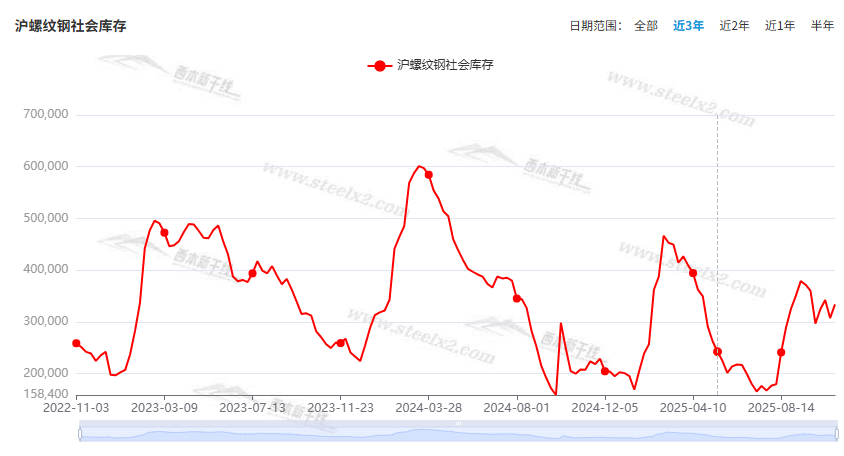 据西本资讯监测库存数据:截至10月30日,沪市螺纹钢库存总量为33.37万吨,周环比增加2.65万吨,增幅为8.63%(见下图);目前库存量较上年同期(10月31日的20.75万吨)增加12.62万吨,增幅为60.82%。本周沪市螺纹钢库存环比回升,显示资源陆续补充。