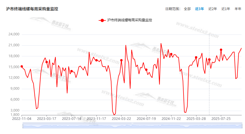 本期,西本资讯监测的沪市线螺周终端采购量为2.03万吨,周环比增加4.10%(见下图)。本周终端需求环比继续增加,显示刚需表现良好。