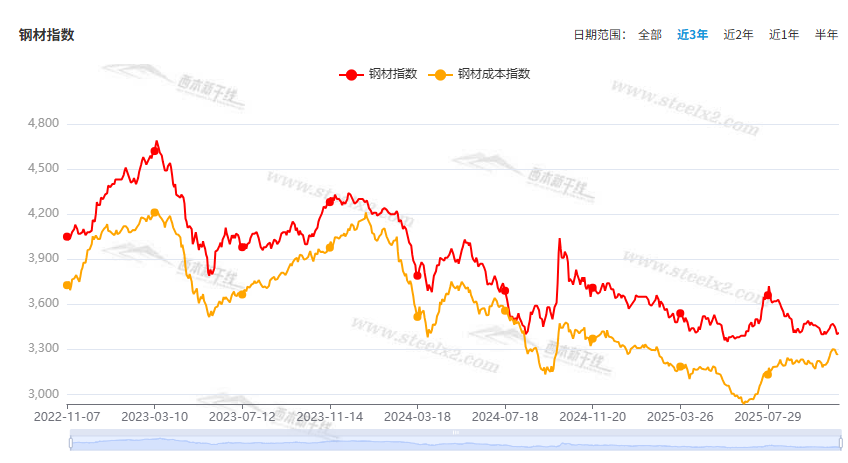 本期,全国各地市场建筑钢材价格波动偏弱:其中,北方钢厂托市,小幅调整;南方期货打压,环比下跌。本周西本钢材指数下调,成本指数回落,显示长流程钢厂利润空间没有拓展;本周螺纹钢期货主力合约低位运行,对现货有抑制作用。(下图为红色线条为钢材指数,黄色线条为成本指数)